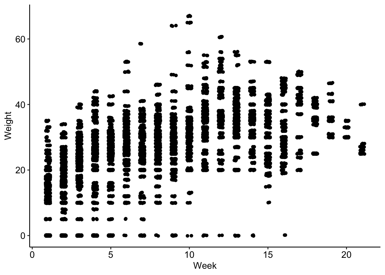 The following scatterplot illustrates the typical pack weight by week of the season, across all years: