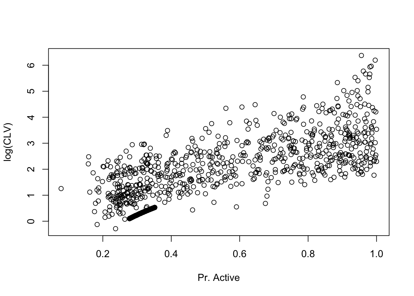 Figure 3: The x-axis is the probability of an individual customer remaining active at the end of the period. The y-axis is the discounted residual lifetime value (CLV) for the customer’s expected future spending (note the log scale). We can easily see that customers with higher probability of active status tend to have higher CLV, but there is some variability within customers of a similar probability neighborhood.