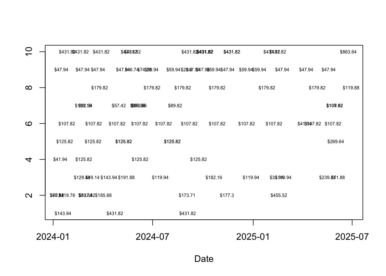 Now that we obtained an estimate of the CLV for each customer, we can begin interrogating the estimates for patterns. For example, what makes for a customer with high CLV? To answer this, I sampled randomly from the top 1% of customers by CLV. I then plotted their transaction log history over the period: