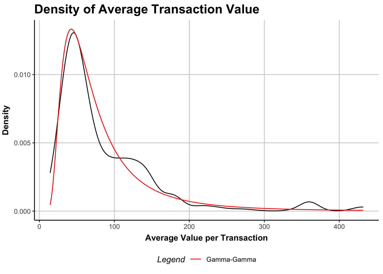 Figure 2: Distribution of average transaction values across customers, with Gamma-Gamma model overlay (red).