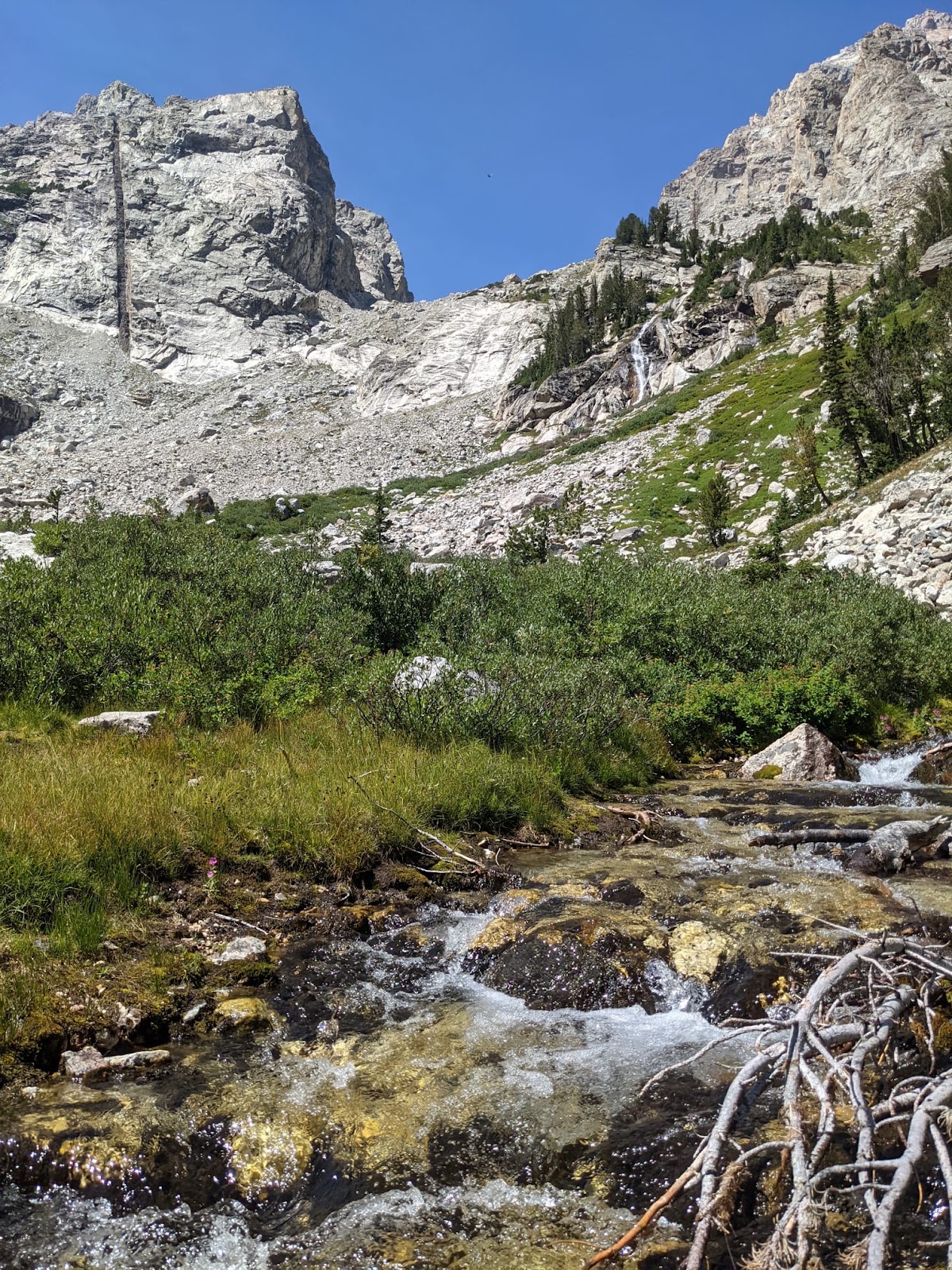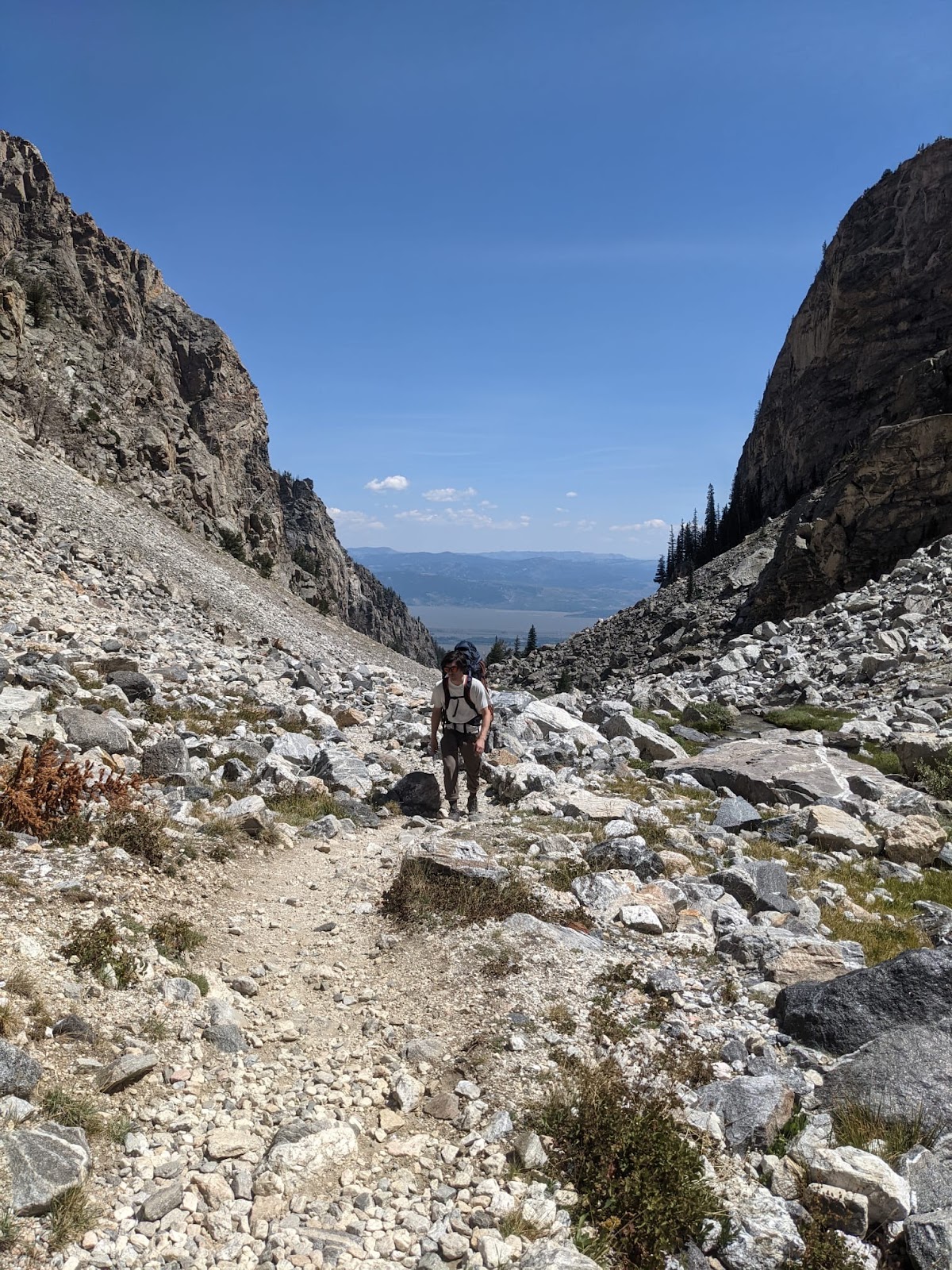 The approach through Garnet Canyon is relentlessly uphill and rocky. Perhaps it was fortuitous that neither of us had climbed in the alpine before, because we had no comparison for the brutal uphill approach. We left the Lupine Meadows trailhead at 10:43am. Our packs were full of gear, food, and water. I understand why people have given the approach its reputation, and a light-and-fast tactic would be far less grueling (although riskier).