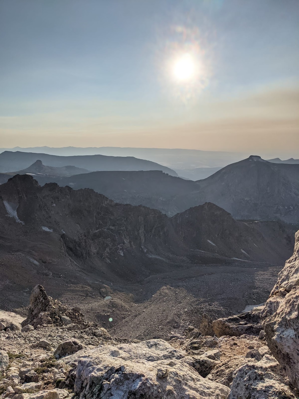 After hobbling to the summit around 11am, we sat and rested as the only party there. Then several soloists and one roped party came up the Owen Spalding. We recognized the roped party as a group of girls we passed on the approach the day before. The leader, Amber, was much more informed about the descent than me so we followed them down. There were one or two rappels, and some exposed downclimbing in one memorable spot. Descent from the Upper Saddle was tiring and steep. Donnie and I both had stinging headaches from the altitude. This made the challenging terrain more frustrating. Coming down from the Lower Saddle was long and treacherous. At least once we got off trail and found ourselves on steep scree slopes. I slipped and fell several times. Traversing the scree to get back on trail was irritating and scary (it seemed like you could lose control and slip >50 feet down the scree).