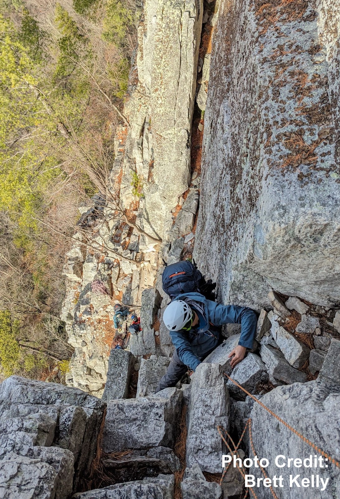 Then we had the challenge of descending down to the West face to access our climbing route, all while continuing to carry our 30-pound packs. The crux of this descent was the fact that we needed water from Roy Gap Run, which runs continually through the Winter, but is located south of the rocks. So Dan and I hiked down the ‘Stairmaster’ trail to the stream, while Evren watched our gear at the base of the climb. In retrospect I’m not convinced that this detour was absolutely necessary. For one, we had already planned on a dry breakfast the next morning since rain was expected early. Also, the three of us had several liters of water between us and knew that we wouldn’t need a lot more to cook dinner for the evening. So I would advise each team member to bring three liters of water (or 2L plus a 20oz gatorade), which should leave everyone with about a liter by the time the team reaches the summit. However if conditions are worse, I expect that more water would be needed, so there is definitely a tradeoff in this strategy.